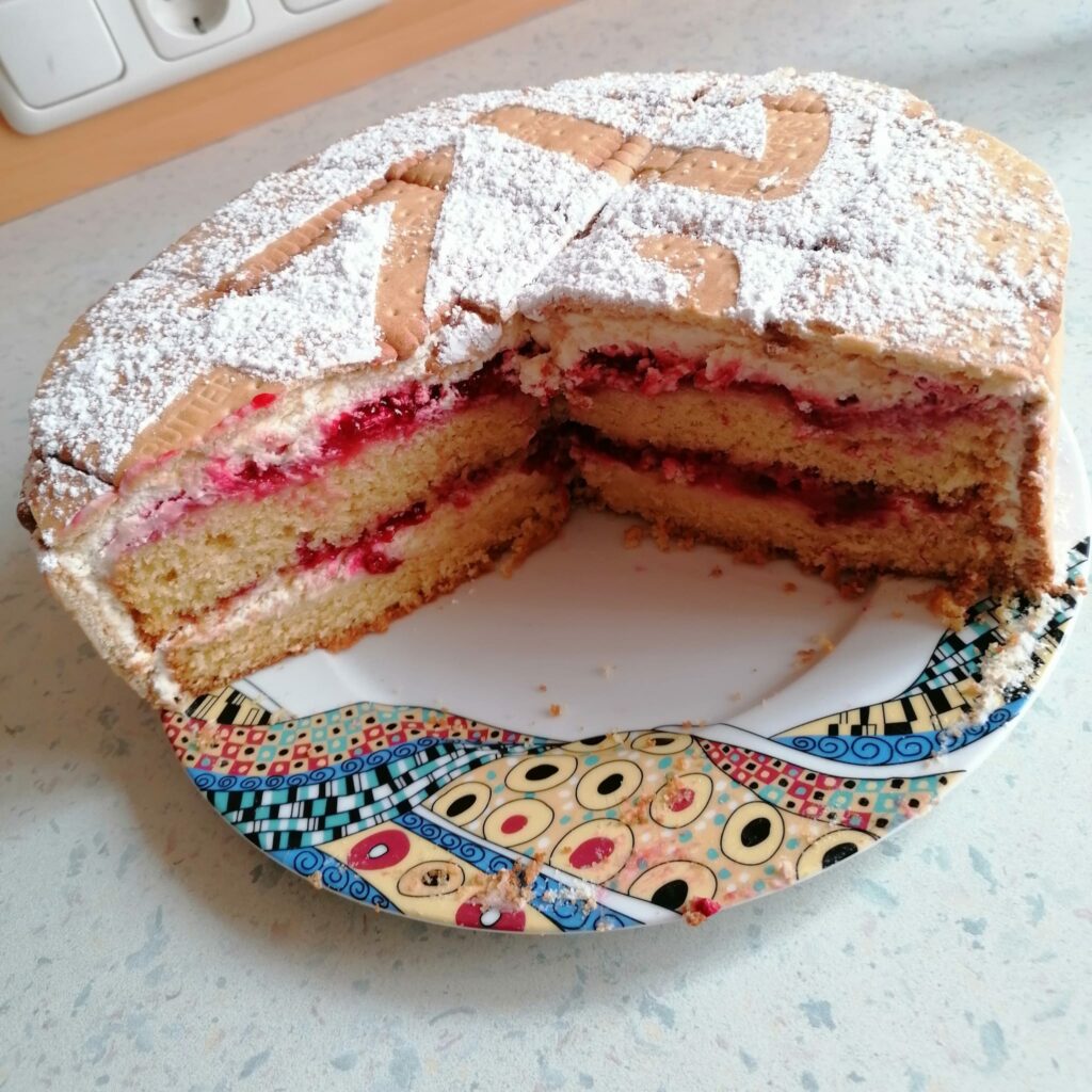 Zuerst den Biskuitboden in der Mitte durchschneiden und mit Marmelade bestreichen.