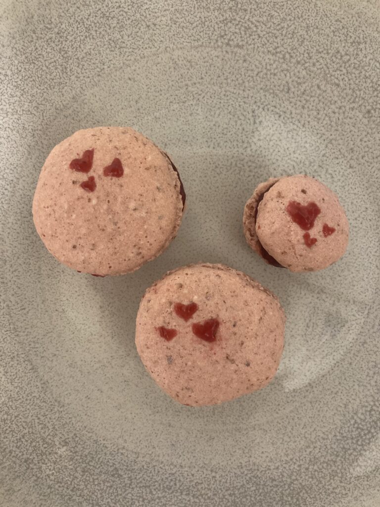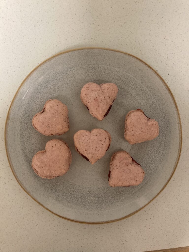 Füge die Mandel-Puderzucker Masse in 3 Portionen hinzu. Fülle die Masse in einen Spritzbeutel und spritze runde oder Herzförmige Macarons auf ein Backblech.