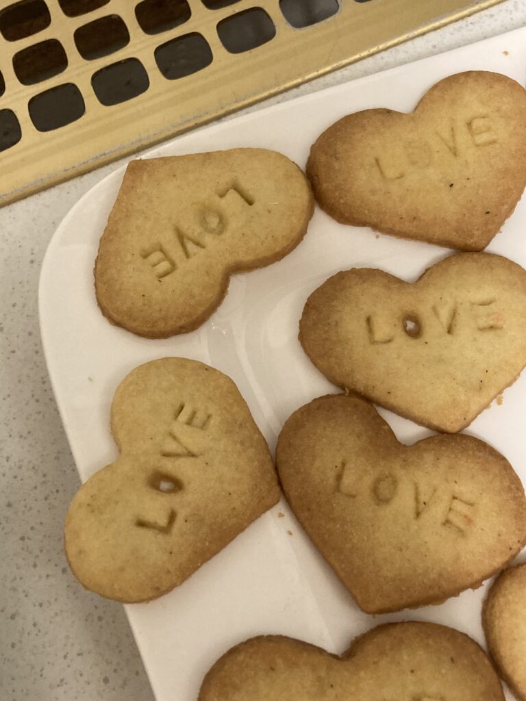 Den Mürbteig ausrollen und Herzen ausstechen. Mit Buchstaben Wörter, Namen oder kleine Botschaften reindrücken. Die Kekse backen.